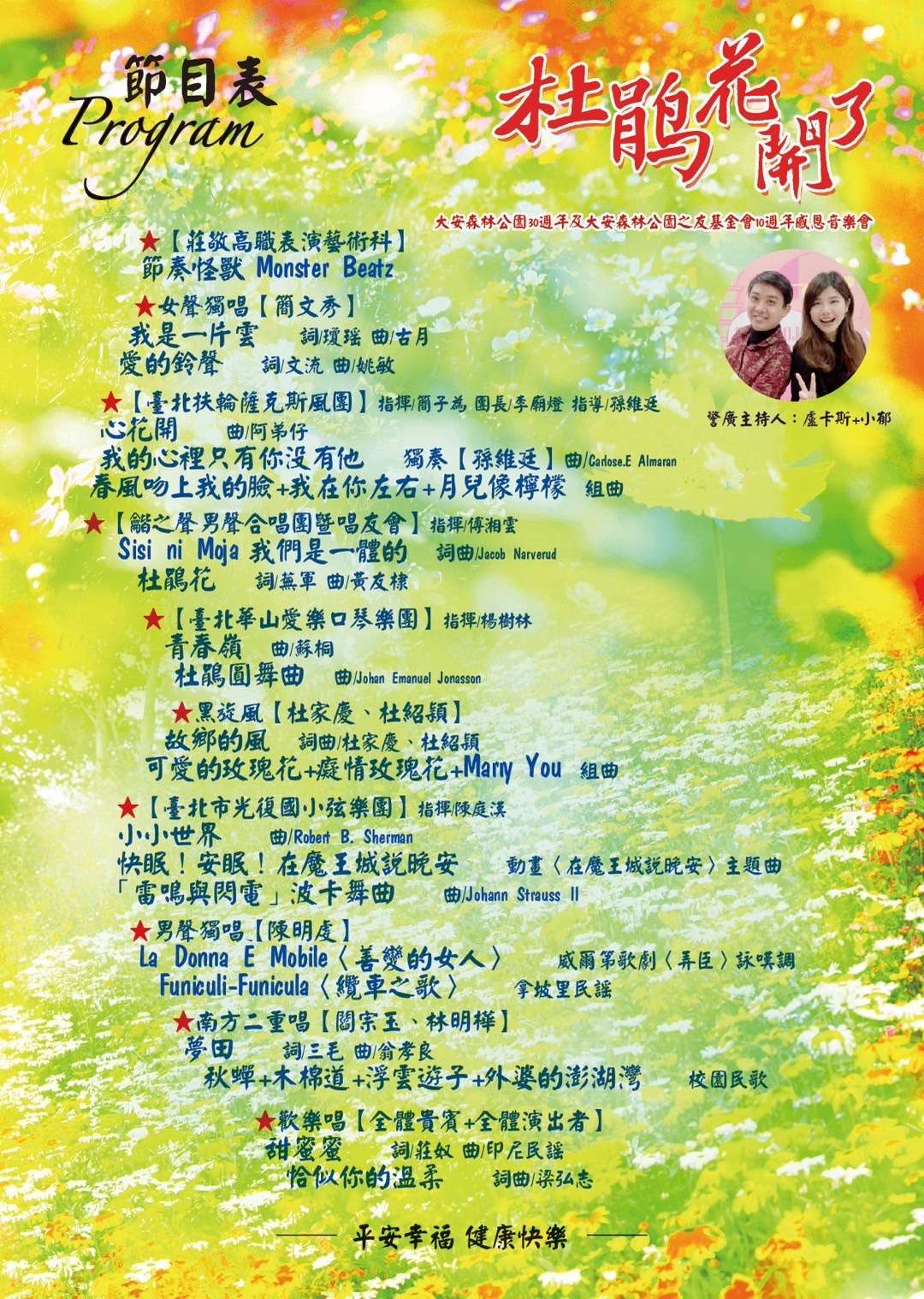 一、被譽為城市之肺的大安森林公園開園迄今屆滿30周年,而 長年致力於公園保育及維護的大安森林公園之友基金會也 成立10周年,為了慶賀生態環境守護有成,特結合今年 「臺北杜鵑花季」舉辦音樂會活動。