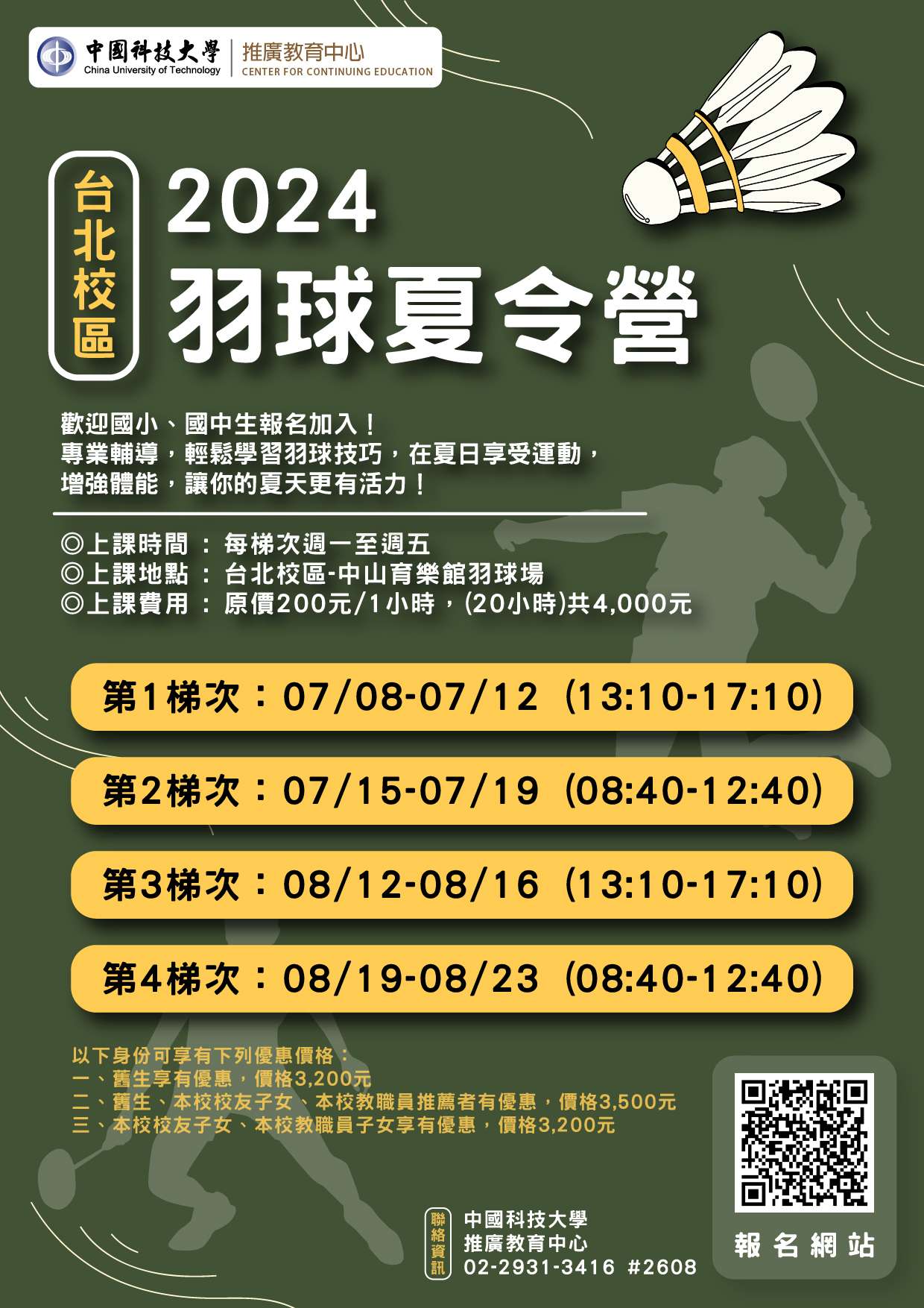 一、旨揭「2024羽球夏令營」謹訂於2024年7月8日至8月23日間 辦理,課程共開設4梯次: