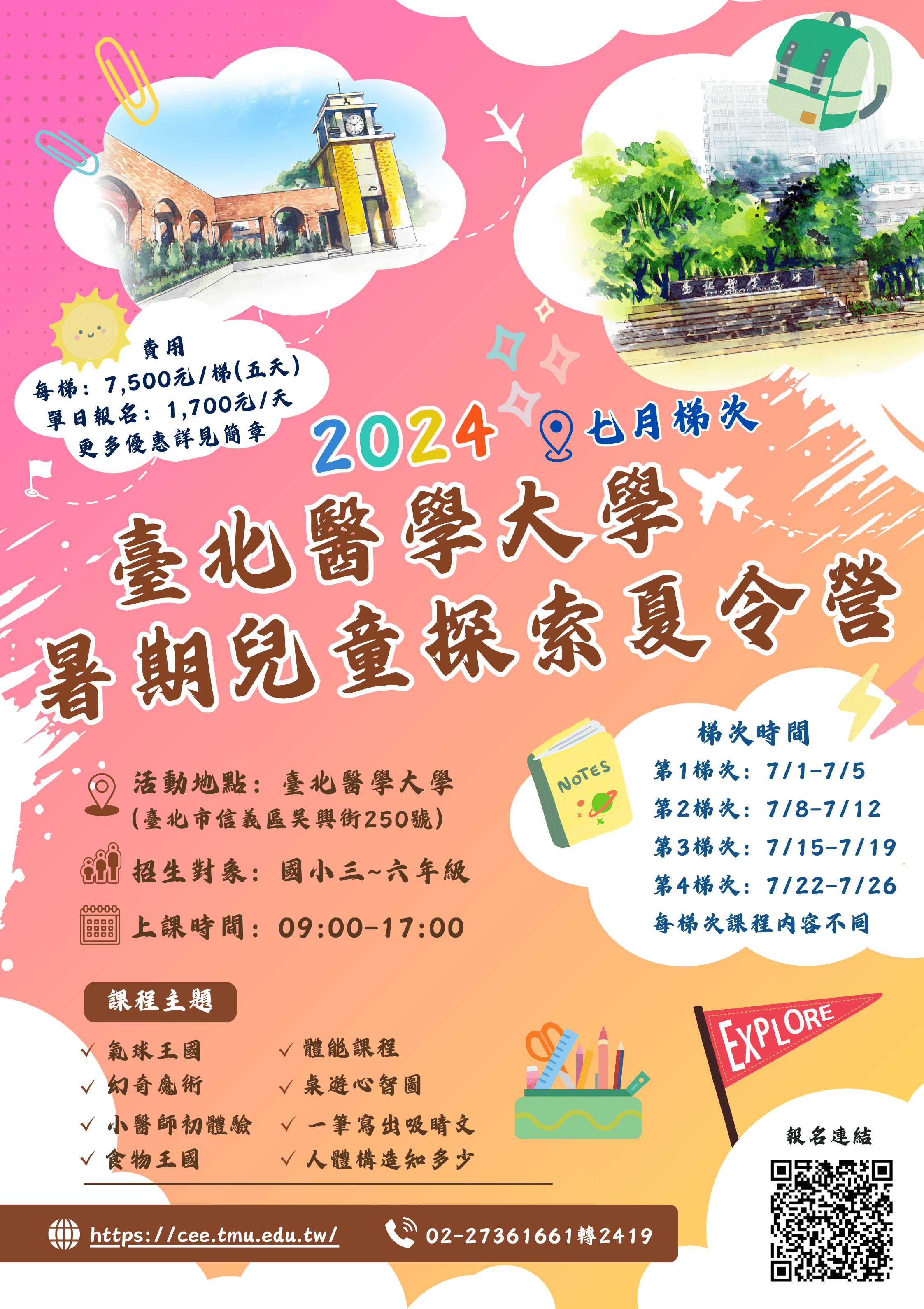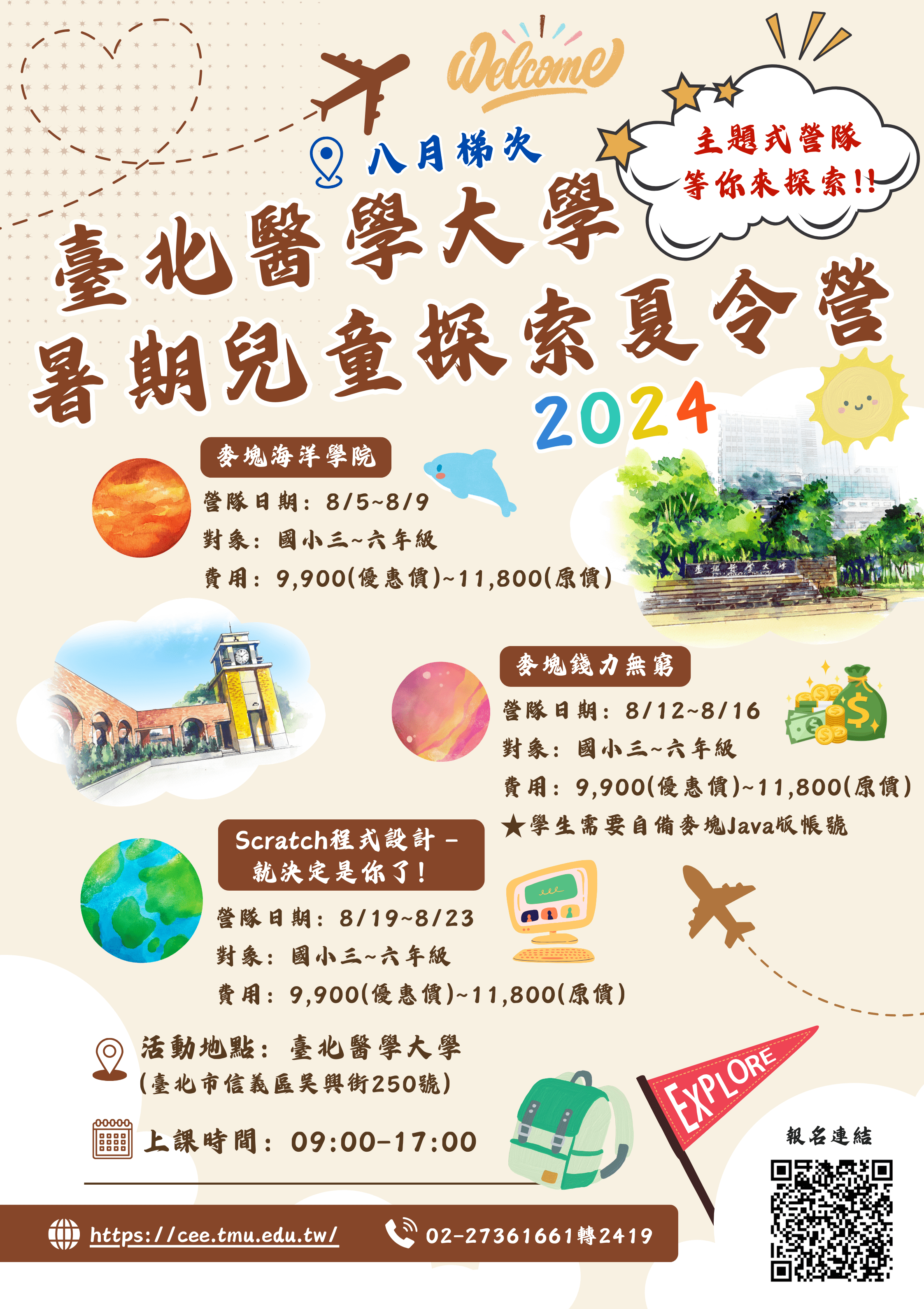 二、營隊資訊:2024臺北醫學大學暑期兒童探索夏令營擬訂於 民國113年7月1日至8月23日辦理。網址 http://tmucamp.tmu.edu.tw/