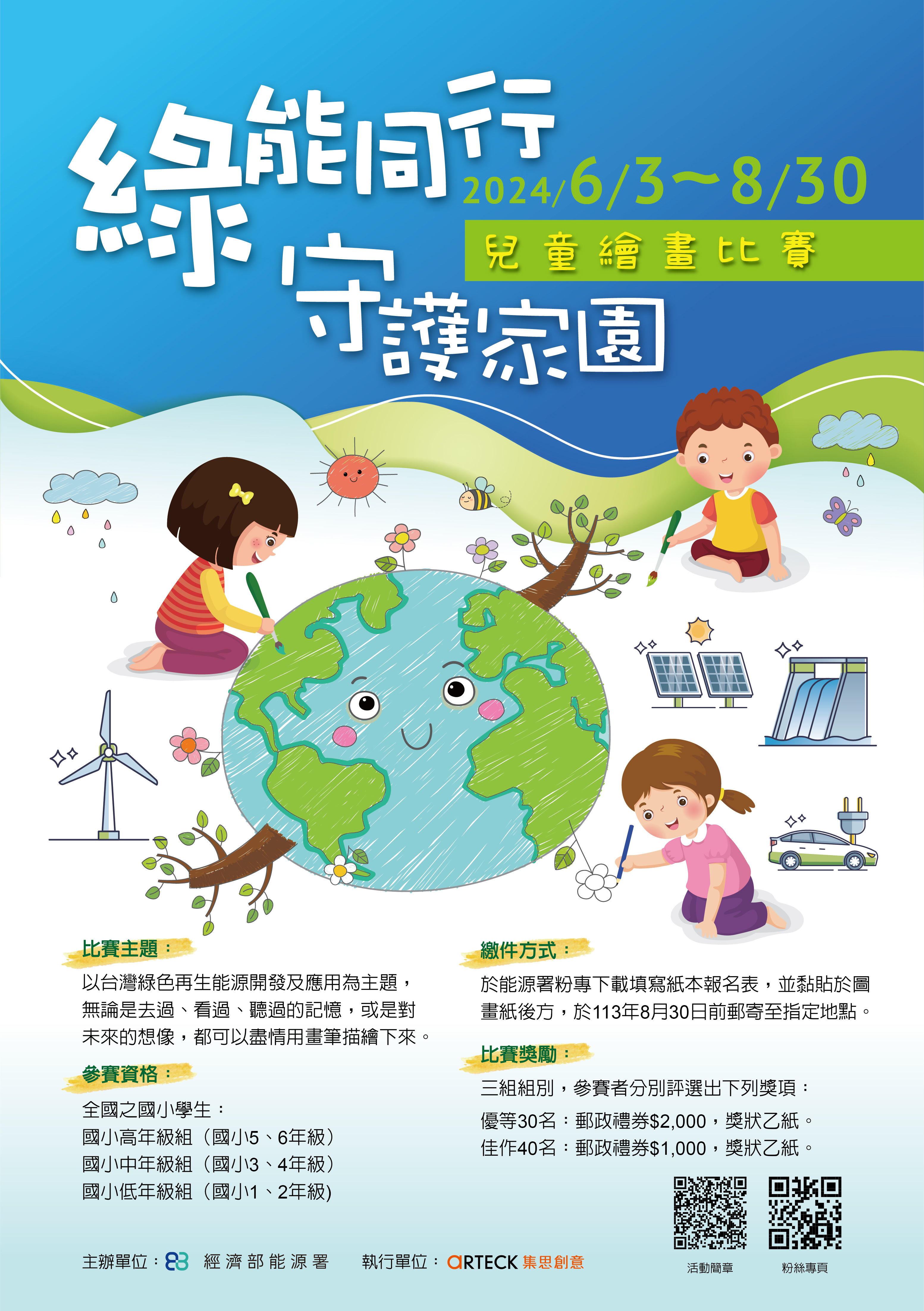 二、綠能發展不僅提升我國能源自主性及改善環境品質,為下 一代奠定能源永續發展之基礎,該署舉辦2024「綠能同行 守護家園」兒童繪畫比賽,鼓勵兒童以各式發展中之綠能 為靈感,運用色彩及線條等彩繪方式,展現無限想像力及 創造力。