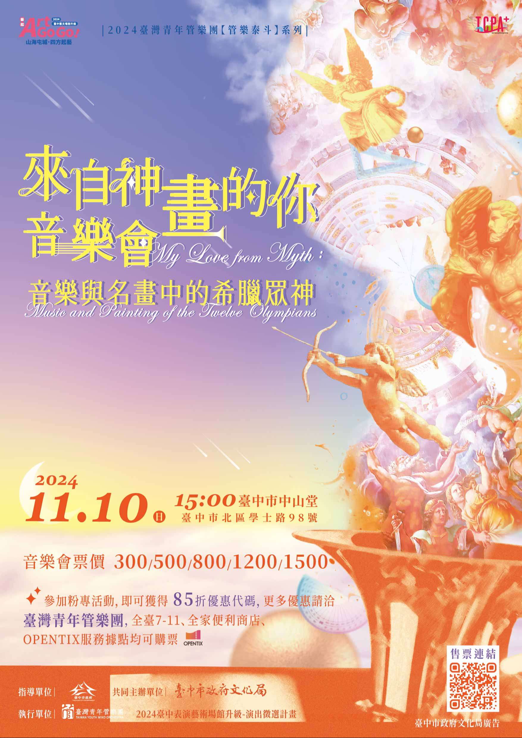 二、節目介紹:臺灣青年管樂團『管樂泰斗』系列音樂會, 2024隆重呈現【來自神畫的你】音樂會-音樂與名畫中的希 臘眾神,是一場融合希臘神話與西班牙作曲家奧斯卡·納瓦 羅的《奧林帕斯諸神》交響組曲的音樂會。十個樂章生動 描繪十二位神祗,以具挑戰性的曲目展現管樂團的卓越演 奏技巧;特邀Podcaster葵花子在樂章中介紹名畫,讓觀眾 更深入理解神話故事。 音樂會還包含2024委託創作《甘露水音畫-永恆的剎那》交響管樂曲,致敬雕塑作品「甘露水」,誠摯邀請貴校全體師生加入 這場神話與藝術的音樂旅程,一同見證奇妙的永恆剎那。