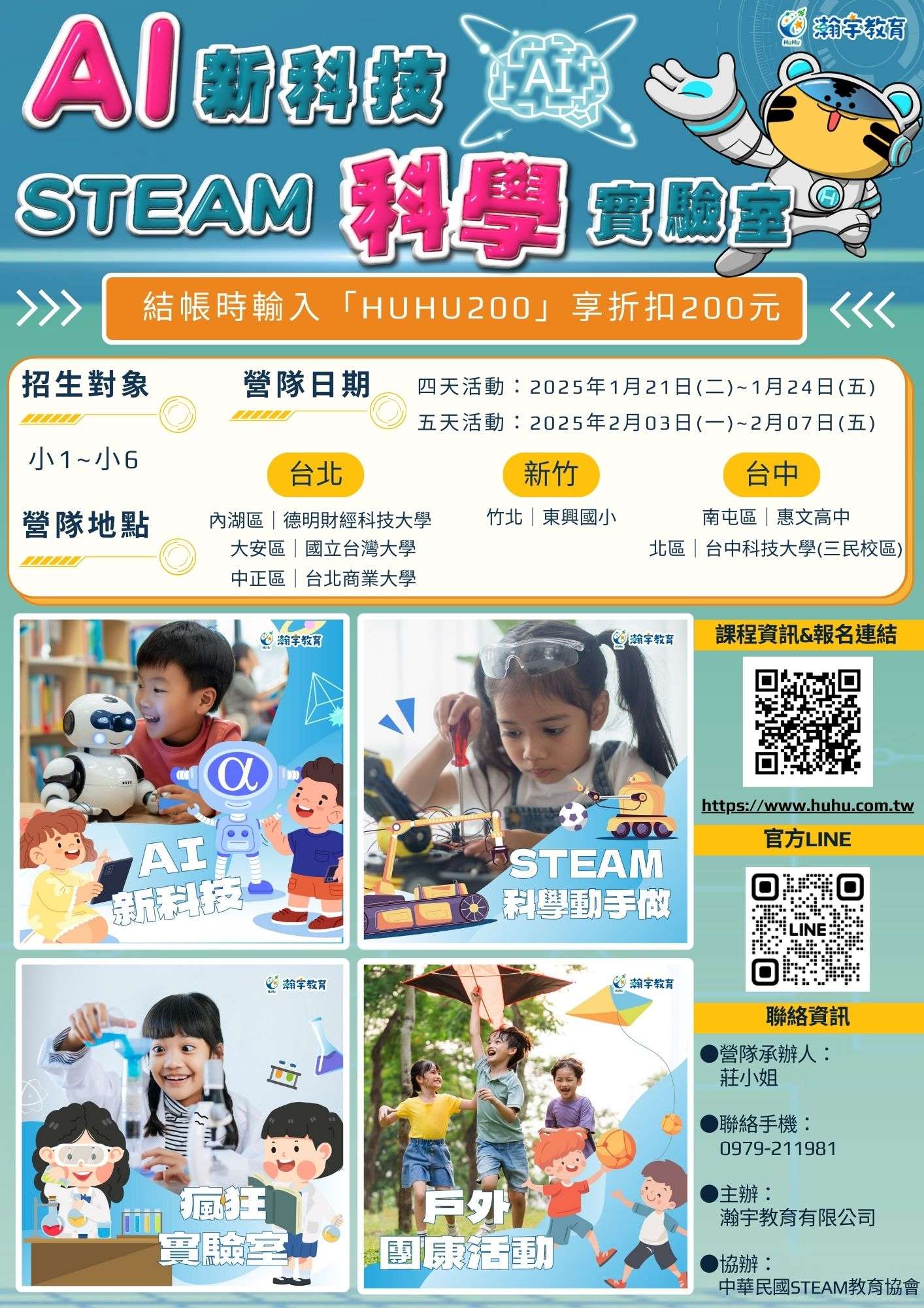 四、更多活動內容及梯次總表,請詳見附件,或搜尋「瀚宇教 育冬夏令營」至報名網站https://reurl.cc/Nlo8A6 ,若 需專人服務請洽詢活動方官方LINE。(LINE ID搜尋 @camphuhu)