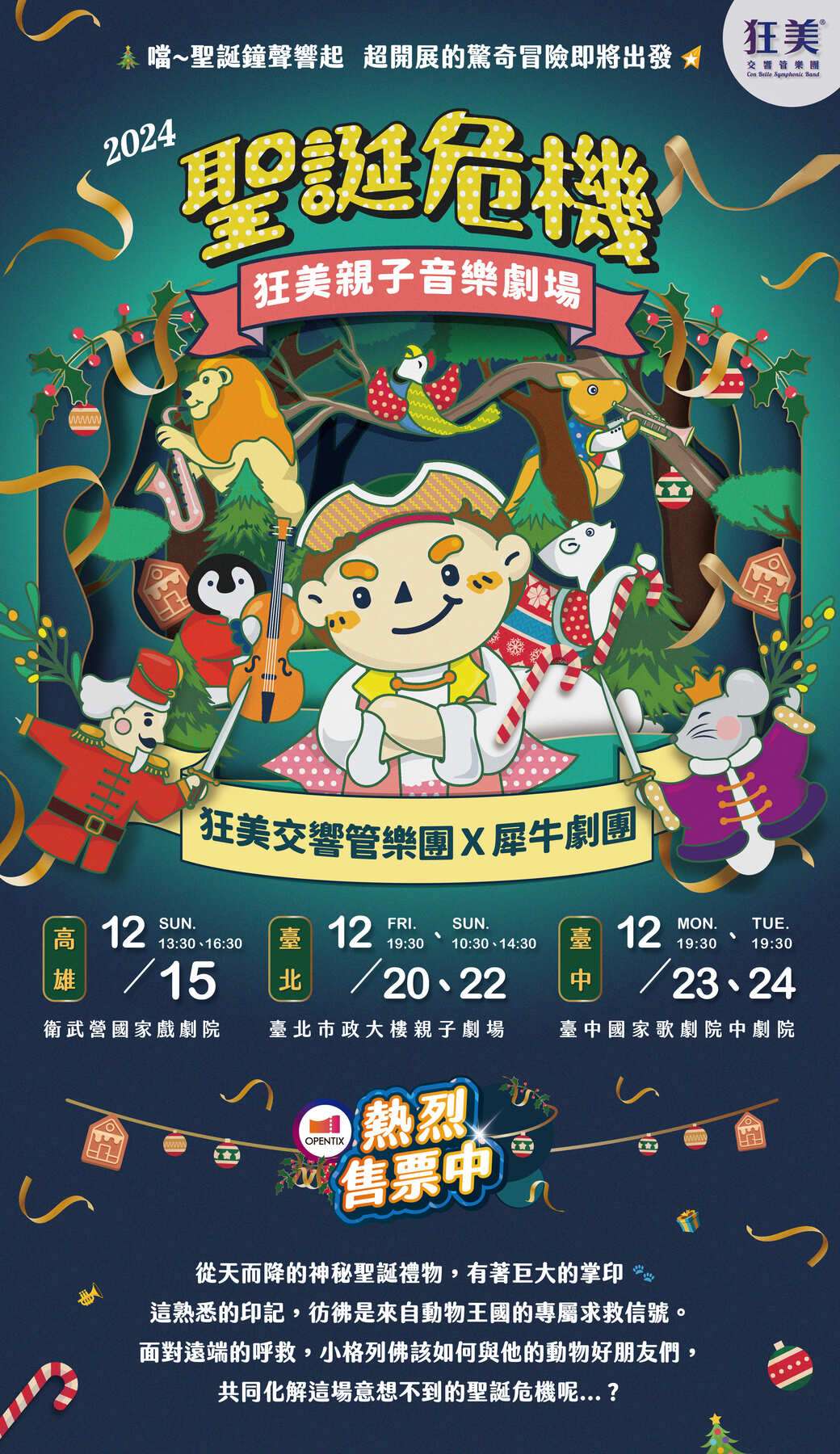 一、節目介紹:狂美交響管樂團x犀牛劇團-跨界親子音樂劇場 《聖誕危機》從天而降的神秘聖誕禮物,有著巨大的掌印這熟悉的印記,彷彿是來自動物王國的專屬求救信號。面對遠端的呼救,小格列佛該如何與他的動物好朋友們,共同化解這場意想不到的聖誕危機呢...?