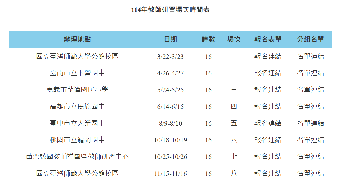(八)第八場次師大2場:114年11月15日(星期六)至11月16日(星期日);研習地點:本校公館校區;報名連接: