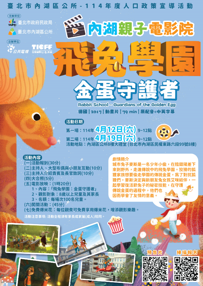內湖親子電影院活動,4月12日及4月19日舉辦,限額100名,報名額滿為止。現場有互動遊戲及免費爆米 花,歡迎家庭一起來參加!
