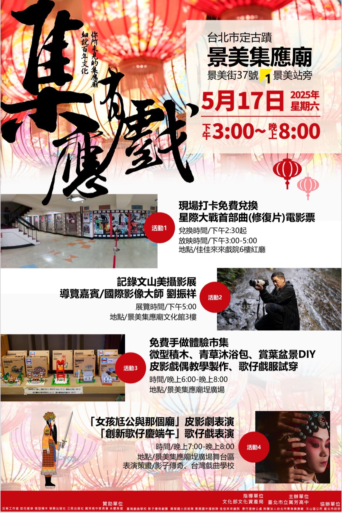 (三)地點:景美集應廟(臺北市文山區景美街37號,景美捷運 站旁)。 (四)內容:記錄文山美攝影展、手作體驗(微型積木、青草沐 浴包、賞葉盆景、皮影戲偶......等12個攤位)、歌仔戲 服試穿、皮影戲及歌仔戲表演等。