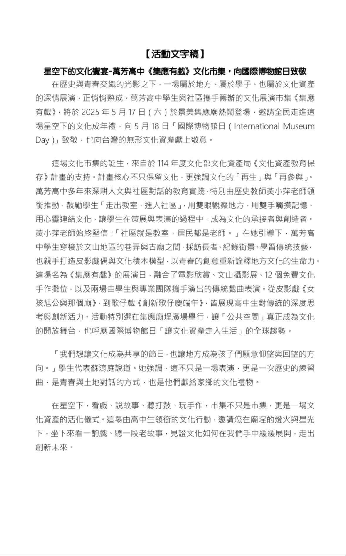一、本校申辦文化部文化資產局「113學年度文化資產保存教育 推動計畫」,辦理系列活動-《集應有戲》,活動資訊如 下: