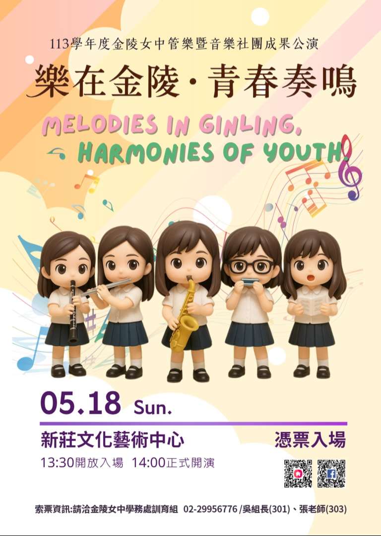 四、表演團隊:金陵女中管樂團、合唱團、曲笛社、口琴獨奏 (全國學生音樂比賽特優第一名)、英語歌唱(本校雙語精進 班榮獲新北市英唱比賽特優)、欣響室內管樂團。