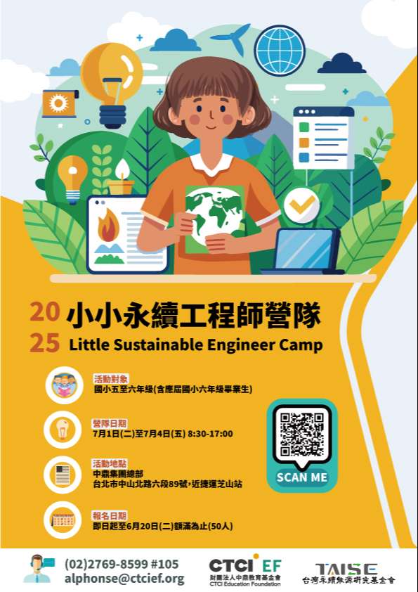 三、活動資訊摘要: 報名資訊:即日起至114年6月20日(五)止 (50人為限,額滿即止),僅接受網路報名,敬請進入活動 報名網頁 (https://reurl.cc/Z4vlEp) 報名資格:114學 年度國小五、六年級生(含應屆畢業生)。活動時間:2025年7月1日(二)至7月4日(五) (不過夜營隊)。 敬請持續關 注本會臉書粉絲專頁(https://www.facebook.com /CTCIEF/ ) 及官網掌握活動消息。 活動洽詢:中鼎教育 基金會 林經理,電話:(02)2769-8599 轉105。信箱: alphonse@ctcief.org。