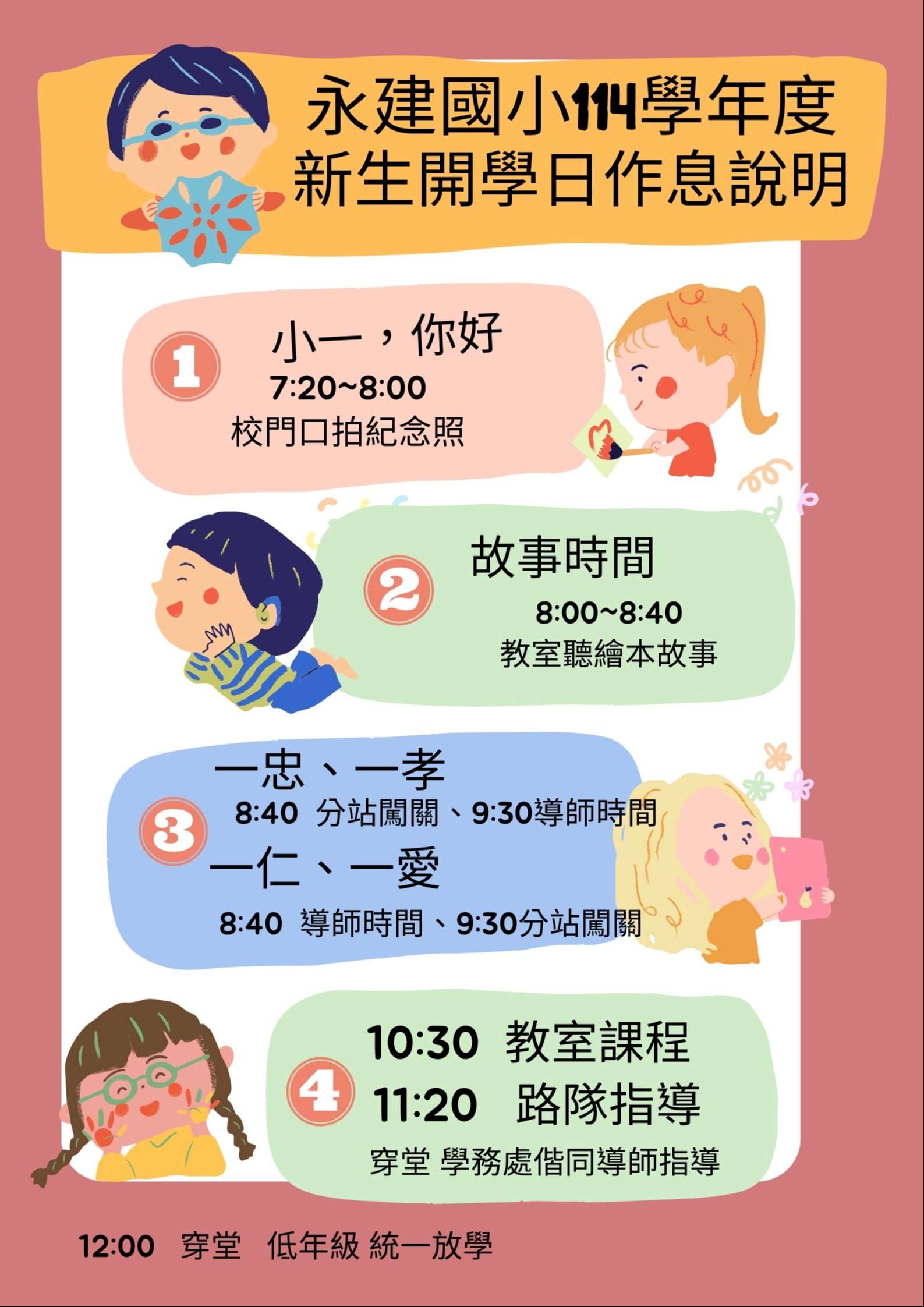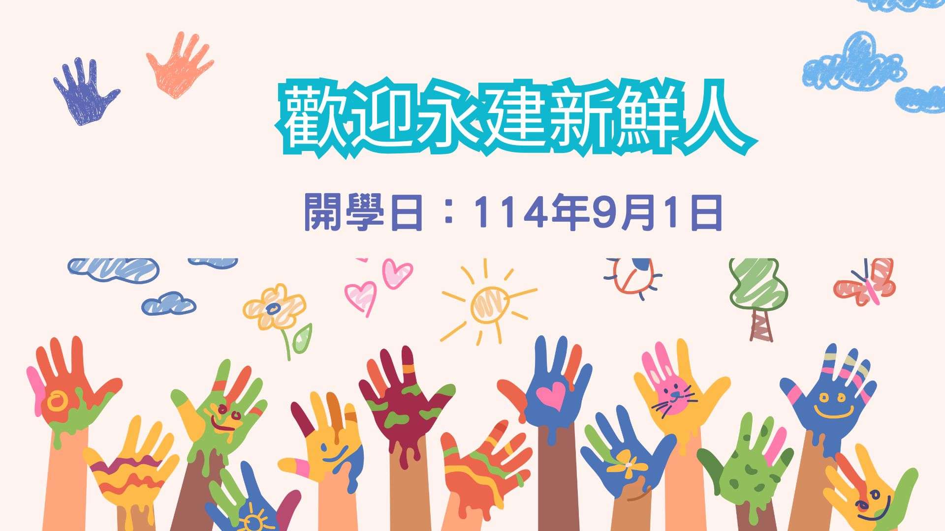歡迎您和寶貝一起加入永建這個大家庭,新生開學活動的相關說明,已經公告在雲端囉!!歡迎參閱。讓我們一起陪伴孩子,適應小學新生活。期待親師間的合作,為孩子開拓更寬廣的發展空間。若有相關疑問或聯繫,請聯絡輔導室袁主任,電話29377199#151。謝謝。