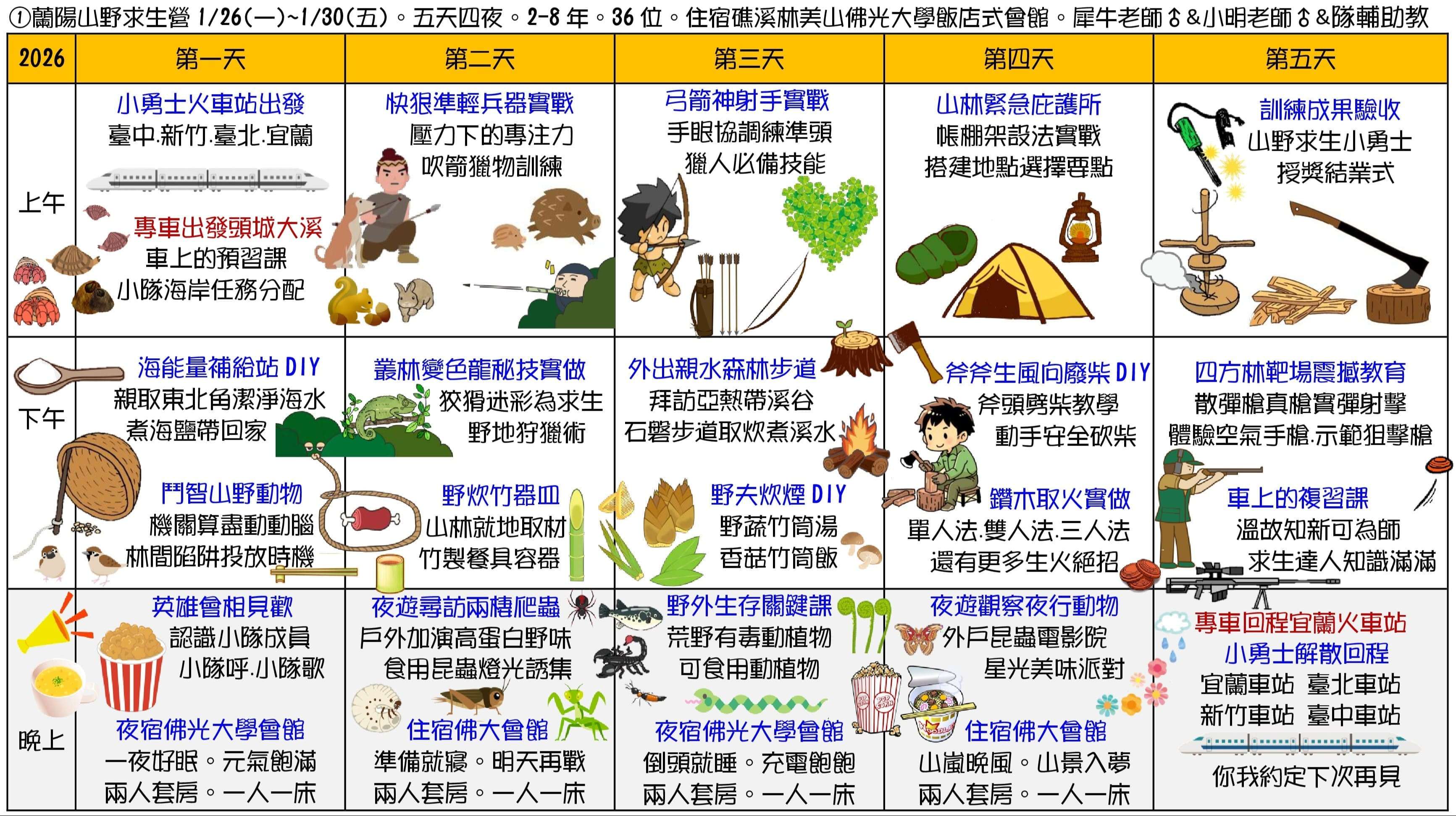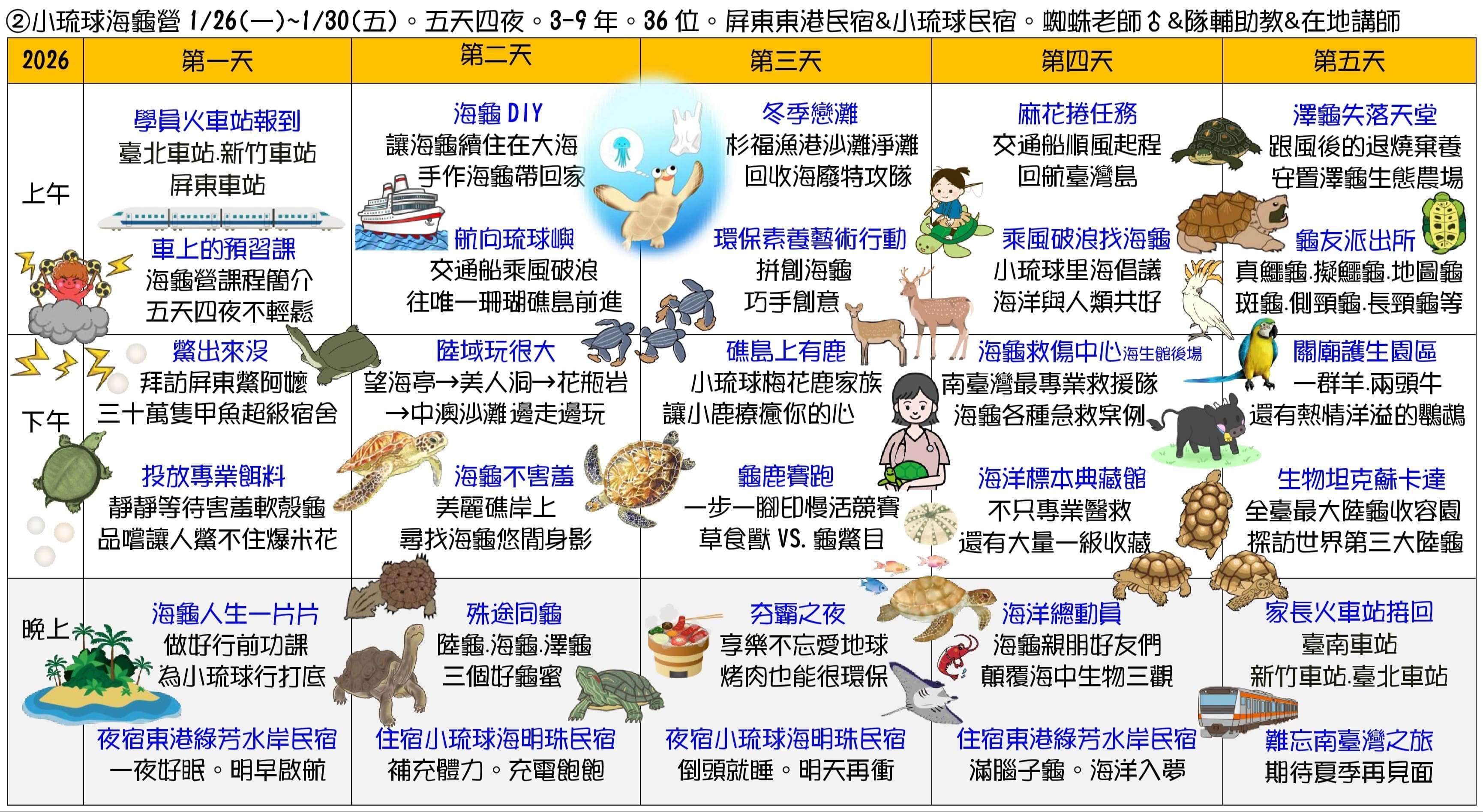 二、課程主題:①蘭陽山野求生營(5天4夜)、②小琉球海龜營 (5天4夜)、③宜蘭生態農場營(3天2夜)、④TPE博物館生態 營(3天外出不過夜)、⑤屏東柚園攀樹營(3天外出不過 夜)、⑥節肢小怪獸營(3天大學不過夜)、⑦池上單車生態 營(4天3夜)。