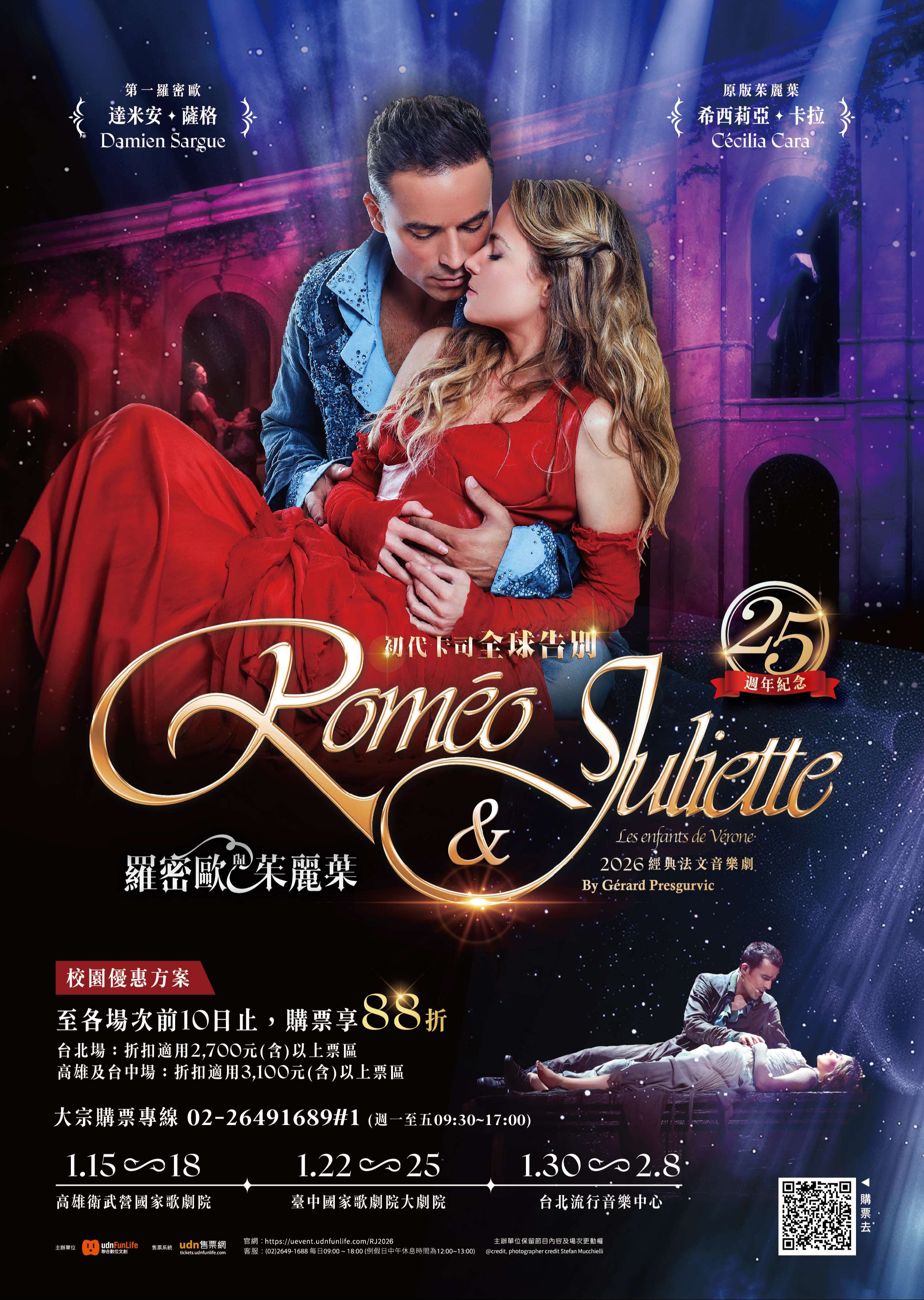 一、經典法文音樂劇《羅密歐與茱麗葉》自2001年在巴黎首演 即轟動全球,以磅礴動人的音樂、現代感十足的編舞與都 市巴洛克風格美學,重新詮釋莎士比亞經典悲劇,劇中更 以紅與藍兩大色系象徵家族對峙,展現強烈視覺張力;而 初代卡司的演出早已成為大眾心中難以取代的記憶,本次 適逢音樂劇25周年同時也是初代卡司告別巡演,讓這次在 台灣的演出更具紀念性。法文音樂劇以獨樹一格的「演唱 會」形式製作打造,特別強調「音樂」與「演員魅力」, 以「歌」帶「戲」是法式音樂劇製作的順序與模式,藉由 歌曲詠唱以及雋永詞彙的表達,再加上多樣化背景音樂襯 托,讓演員的情緒起伏及情感傳遞更加深刻。誠摯推薦師生前來觀賞國際級精彩演出,並藉此增進對各類表演類型 的了解。