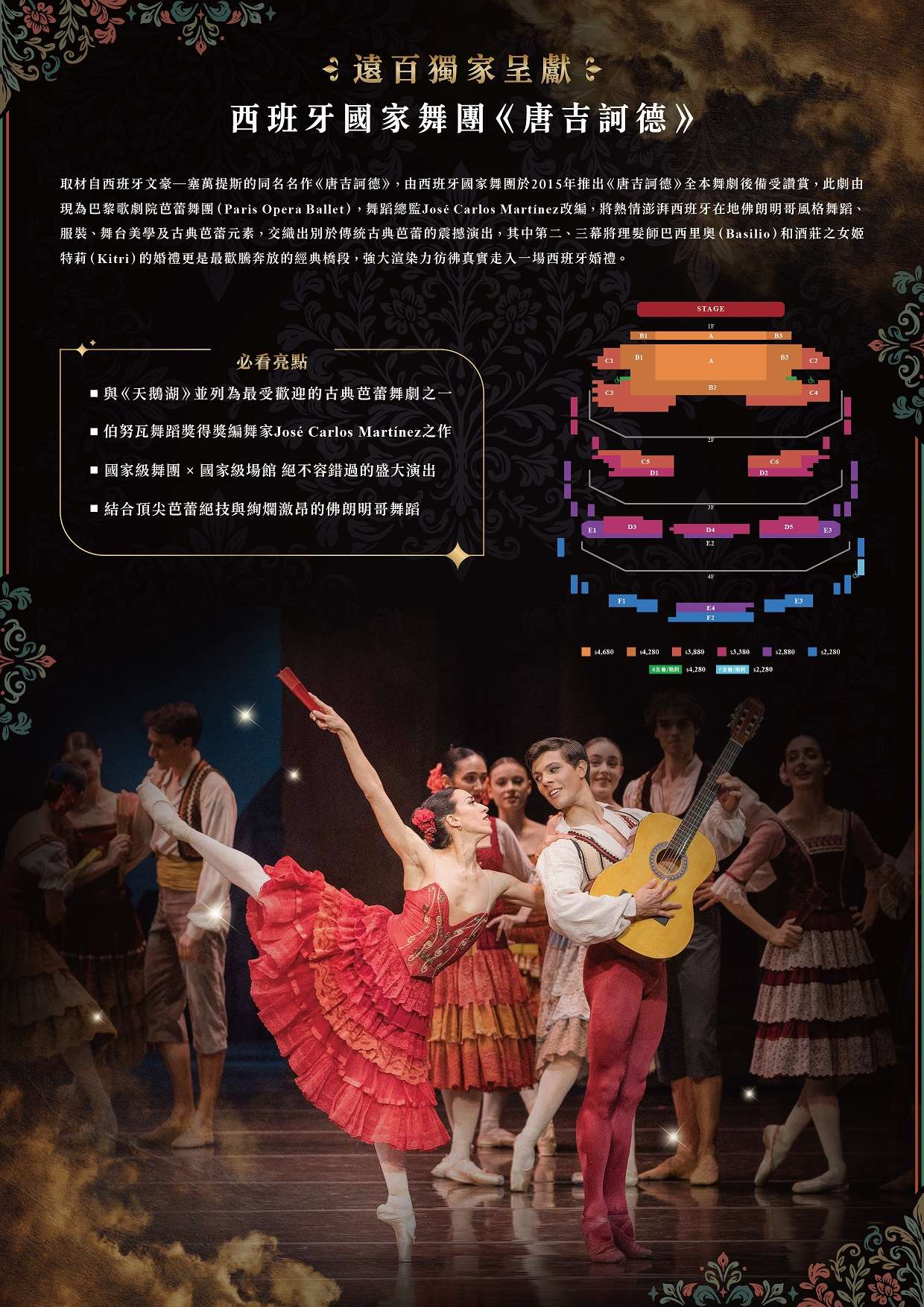 (五)本次演出版本由現任巴黎歌劇院芭蕾舞團舞蹈總監、伯 努瓦舞蹈獎(Benois de la Danse)得主 José Carlos Martínez 改編創作。Martínez 以19世紀「古典芭蕾之 父」莫里斯.佩蒂帕(Marius Petipa)的經典版本為基 礎,在尊重古典技術體系與結構框架的前提下,融入更 鮮明的西班牙文化元素,使人物性格更加立體,並透過 舞段節奏與場景轉換的流動設計,讓敘事更為緊湊而富 層次。